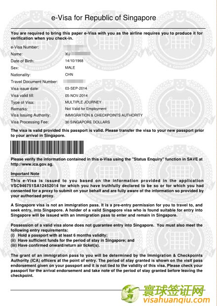 徐小姐的新加坡旅游簽證頁: