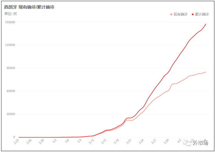 截止發(fā)稿,西班牙現(xiàn)有確診85610例,累計確診153222例,死亡15447例,治愈52165例。從曲線上看,西班牙疫情增長人數(shù)在逐步的放緩,疫情得到較好的控制。