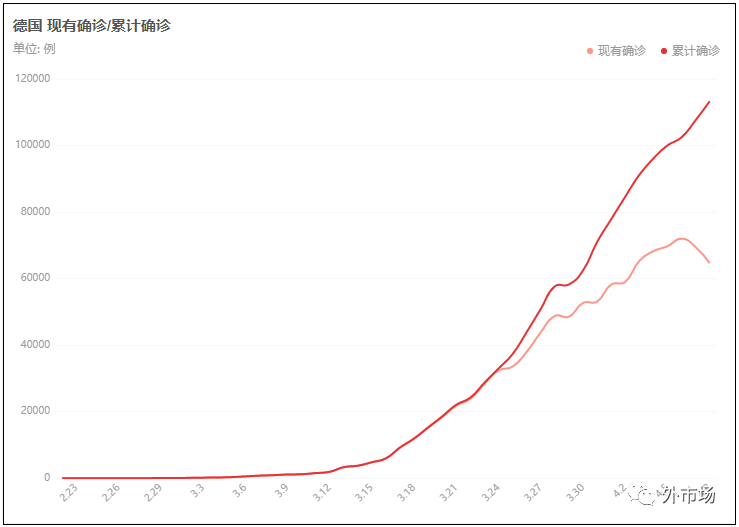 截止發(fā)稿,德國新增確診5404例,累計確診113296例,死亡2256例,治愈36081例。從曲線上來看,德國現(xiàn)有確診人數(shù)已經呈下降趨勢。