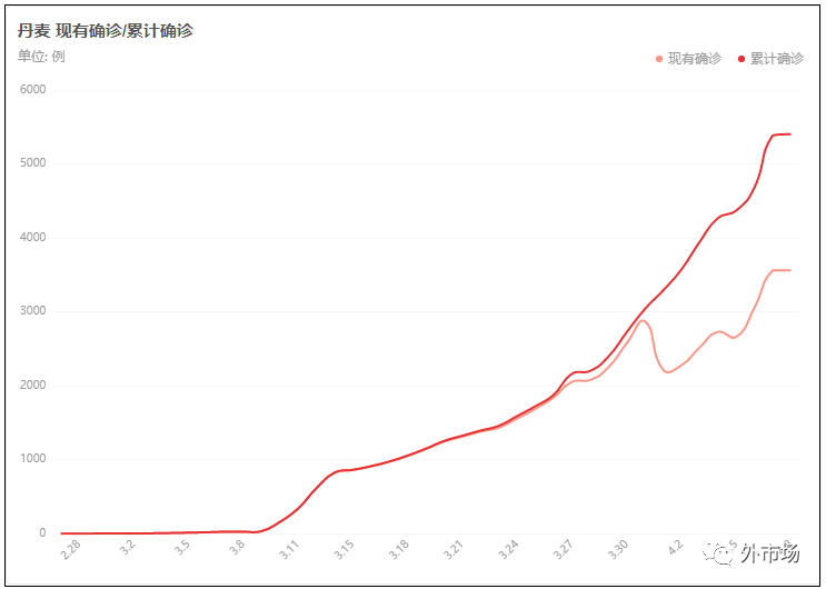截止發(fā)稿,丹麥新增確診195例,累計確診5597例,死亡218例,治愈173例。從曲線上看,丹麥現(xiàn)有確診人數(shù)增幅放緩。