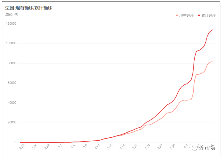 截止發(fā)稿,法國新增確診3881例,累計確診112950例,死亡10869例,治愈21254例。從曲線上看,近日法國現(xiàn)有確診也有所放緩。