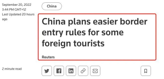 今天,眾多國外媒體報道說,有跡象顯示中國的入境政策正在松動。稱此舉“旨在使一些外國人更容易進入中國,參觀中國邊境的旅游景點”。
