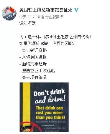 美國駐上海總領事館簽證處發布提示請勿酒駕!為了這一杯,你將付出想象之外的代價!