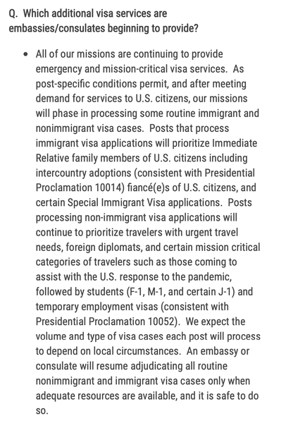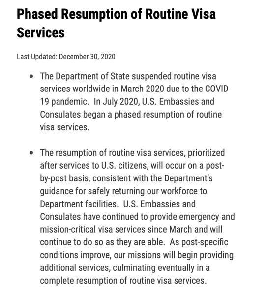 在滿足特定條件的情況下和對美國公民的服務需求之后,美使領館將逐步處理一些常規(guī)的移民和非移民類簽證案件。