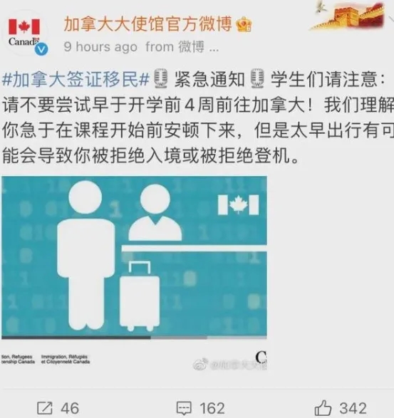 5月29日早上,加拿大駐中國(guó)領(lǐng)事館官方微博發(fā)博,證實(shí)“拒絕入境”措施!提醒留學(xué)生們請(qǐng)勿在開學(xué)日4星期以前嘗試入境,太早出行有可能導(dǎo)致,被拒絕入境或拒絕登機(jī)!