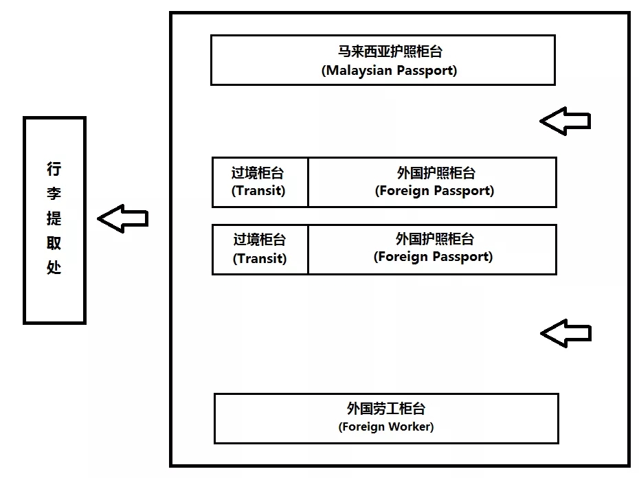 二、請根據赴馬行程選擇合適的入境柜臺。如經吉隆坡國際機場過境前往第三國,停留不超過120小時,可經“Transit”柜臺辦理過境簽入境。