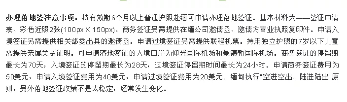 1從2018年10月1日起持有普通護照的中國游客從仰光、曼德勒和內比都國際機場進入緬甸時,提供護照和照片可以辦理落地簽;