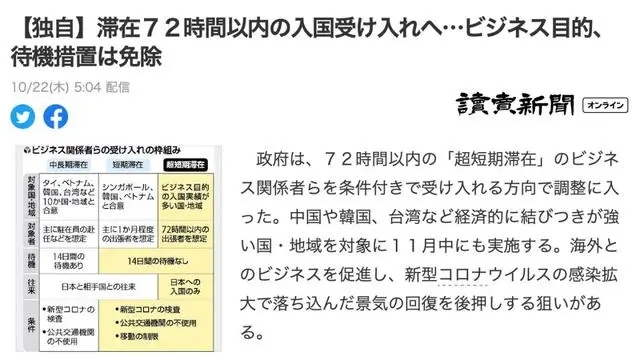 據(jù)共同社報(bào)道,日本政府官員22日透露,政府開始協(xié)調(diào)并有條件地允許出于“超短期”商業(yè)目的在72小時(shí)內(nèi)入境。此舉旨在促進(jìn)在新型冠狀病毒疫情下與海外國家的業(yè)務(wù)。這種做法最早將于11月推出。